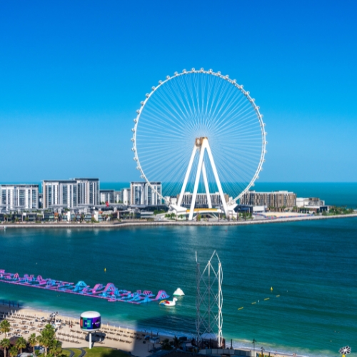 Dubai Harbour starting point, Dubai Eye (Ain Dubai), Blue Waters Island, JBR Beach, The One and Only Hotel, Atlantis The Palm, World Island (far view), Burj Al Arab, Rixos The Palm Hotel, Sheikh Island, and back to Dubai Harbour yacht parking.