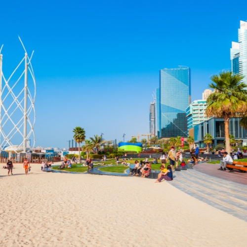 Returning to Dubai Harbour, the route covers Atlantis The Palm, The One&Only Hotel, JBR Beach, Bluewaters Island, and Dubai Eye (Burj Al Arab) along the way.